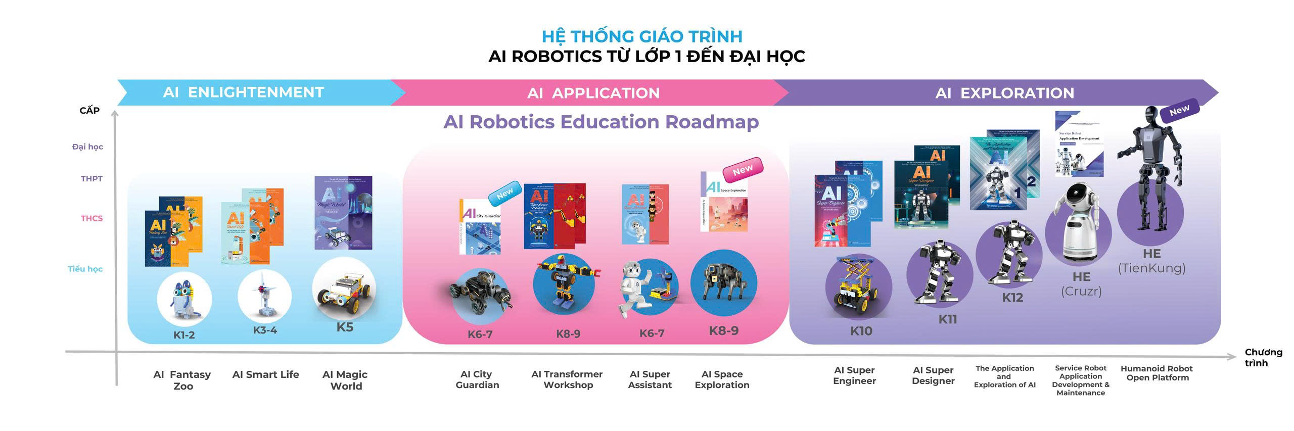 Robot, kiến thức AI, lập trình, cảm biến, tự động hóa và tư duy thiết kế — với sự đồng hành của UBTech, tập đoàn hàng đầu thế giới về giáo dục Robotics. Không chỉ biết cách sử dụng, trẻ còn được học cách sáng tạo cùng công nghệ.